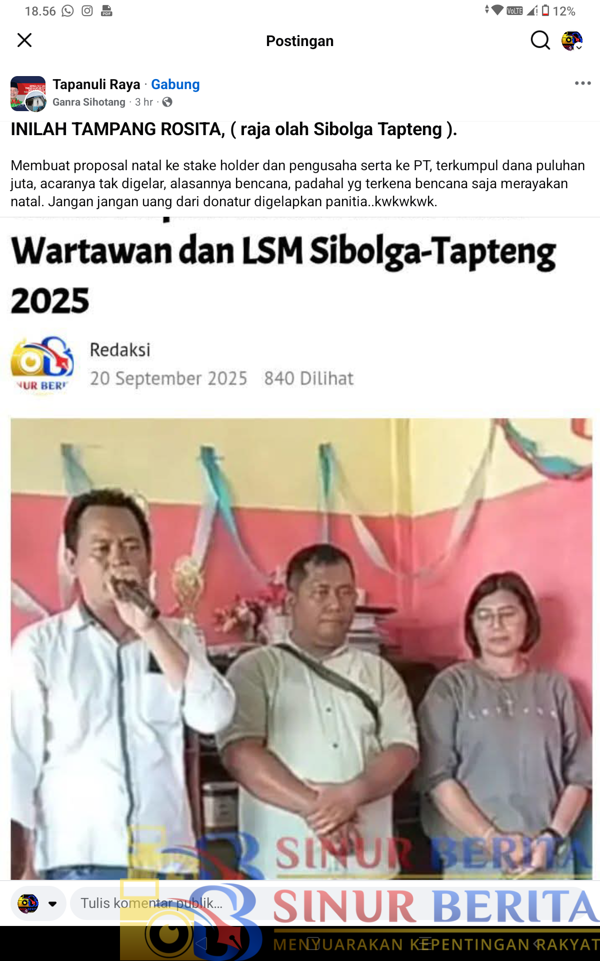 Dalam postingan tersebut dituliskan, “Inilah Tampang Rosita (Raja Olah Sibolga Tapteng). Membuat proposal natal ke stake holder dan pengusaha serta ke PT, terkumpul dana puluhan juta, acaranya tak digelar, alasannya bencana, padahal yg terkena bencana saja merayakan natal. Jangan jangan uang dari donatur digelapkan panitia..kwkwkwk”, tulis akun Facebook Ganra Sihotang.