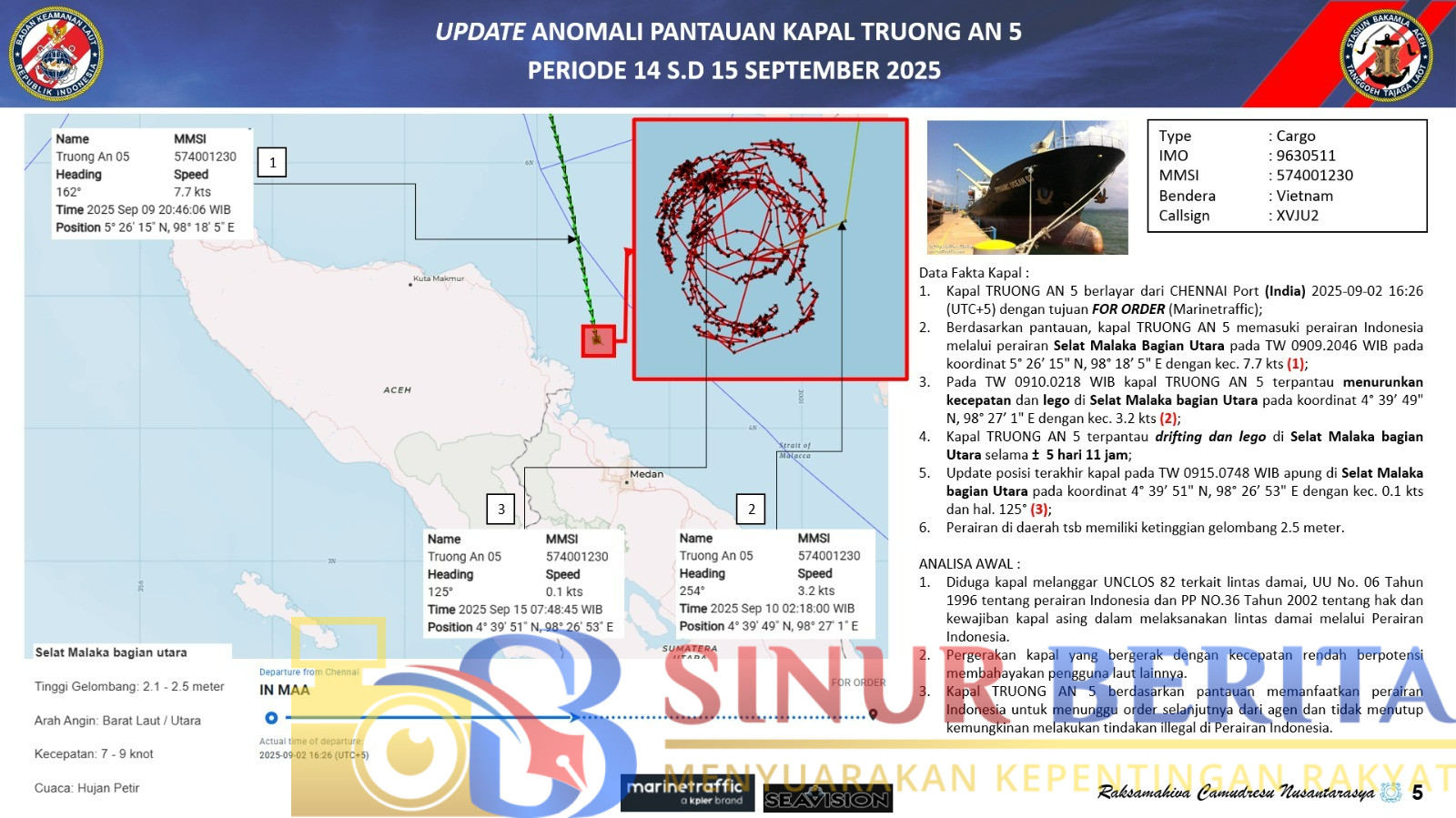 Kapal jenis bulk carrier tersebut terdeteksi oleh Puskodal Bakamla RI saat melaksanakan aktivitas mencurigakan berupa drifting dan lego jangkar pada posisi 04° 39,830 N – 098° 26,940 E, atau sekitar 19 Nautical Mile dari Tanjung Tamiang. Kondisi tersebut dinilai berpotensi membahayakan keselamatan pelayaran kapal lain yang melintas di jalur padat Selat Malaka.