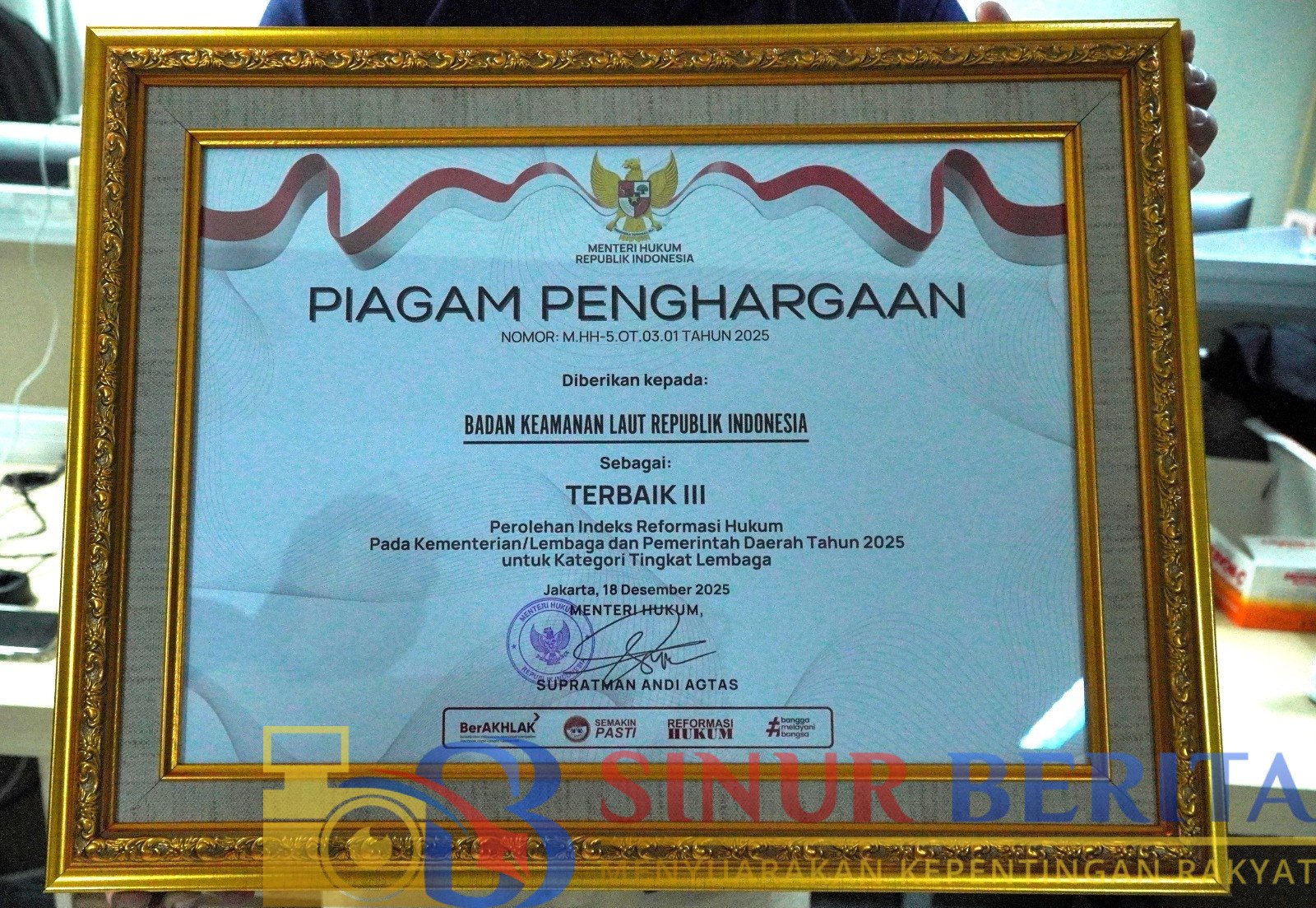 JAKARTA, SINURBERITA.COM – Bakamla Republik Indonesia mendapat penghargaan Tiga Terbaik dalam perolehan Indeks Reformasi Hukum Tahun 2025 Kategori Lembaga. Penghargaan tersebut diberikan langsung oleh Menteri Hukum Republik Indonesia,.Supratman Andi Agtas kepada Deputi Opsla Laksda Bakamla Eko Wahjono dalam acara Refleksi Akhir Tahun Kementerian Hukum Tahun 2025, di Kemayoran, Jakarta Pusat, Kamis (18/12/2025).