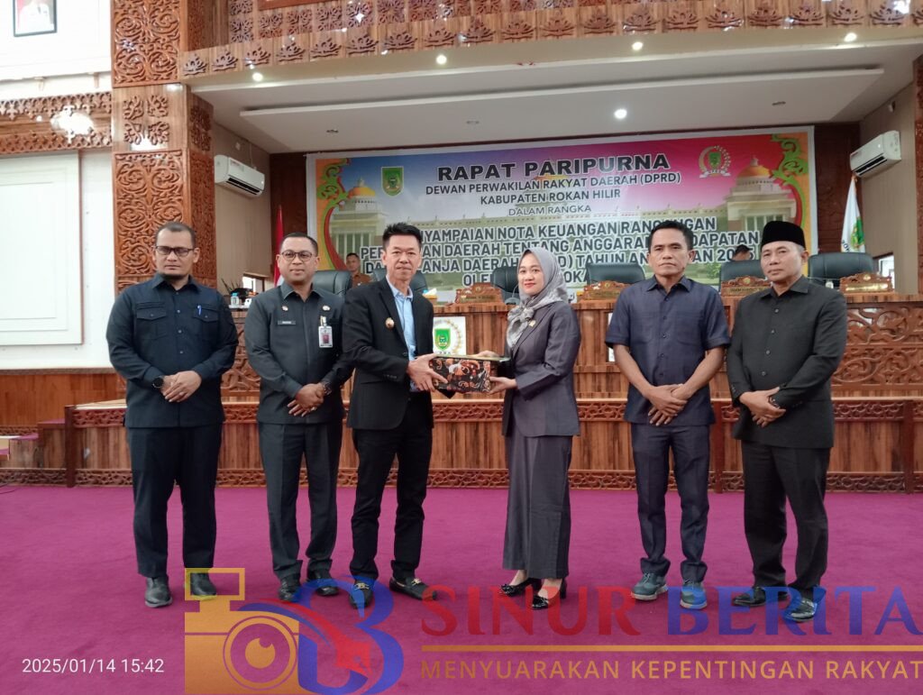 SINURBERITA.COM – Bupati Rokan Hilir Afrizal Sintong sampaikan nota keuangan Rancangan peraturan daerah (Ranperda) tentang Anggaran Pendapatan Belanja Daerah ( APBD ) tahun 2025 melalui rapat paripurna Dewan Perwakilan Rakyat Daerah (DPRD), Selasa ( 14/01/2025) di aula sidang utama Kantor DPRD, Jalan Lintas Pesisir Batu Enam, Bagansiapiapi, Rohil, Provinsi Riau.