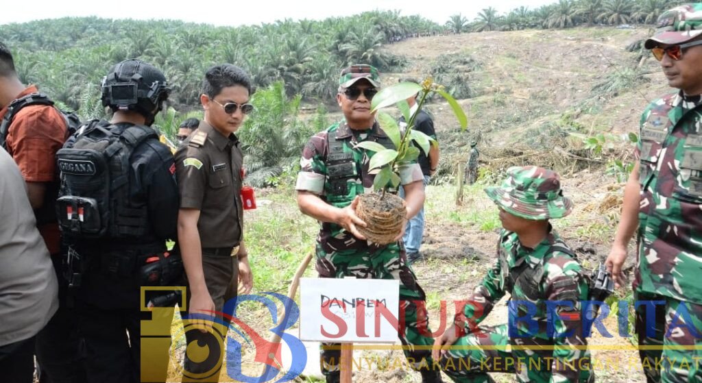PELALAWAN || Dalam upaya mendukung pemulihan kawasan hutan konservasi, Danrem 031/Wira Bima Brigjen TNI Sugiyono melaksanakan kegiatan pemusnahan tanaman sawit ilegal sekaligus penanaman pohon kembali di kawasan Taman Nasional (TN) Tesso Nilo, Desa Segati, Kabupaten Pelalawan, Rabu (2/7/25).