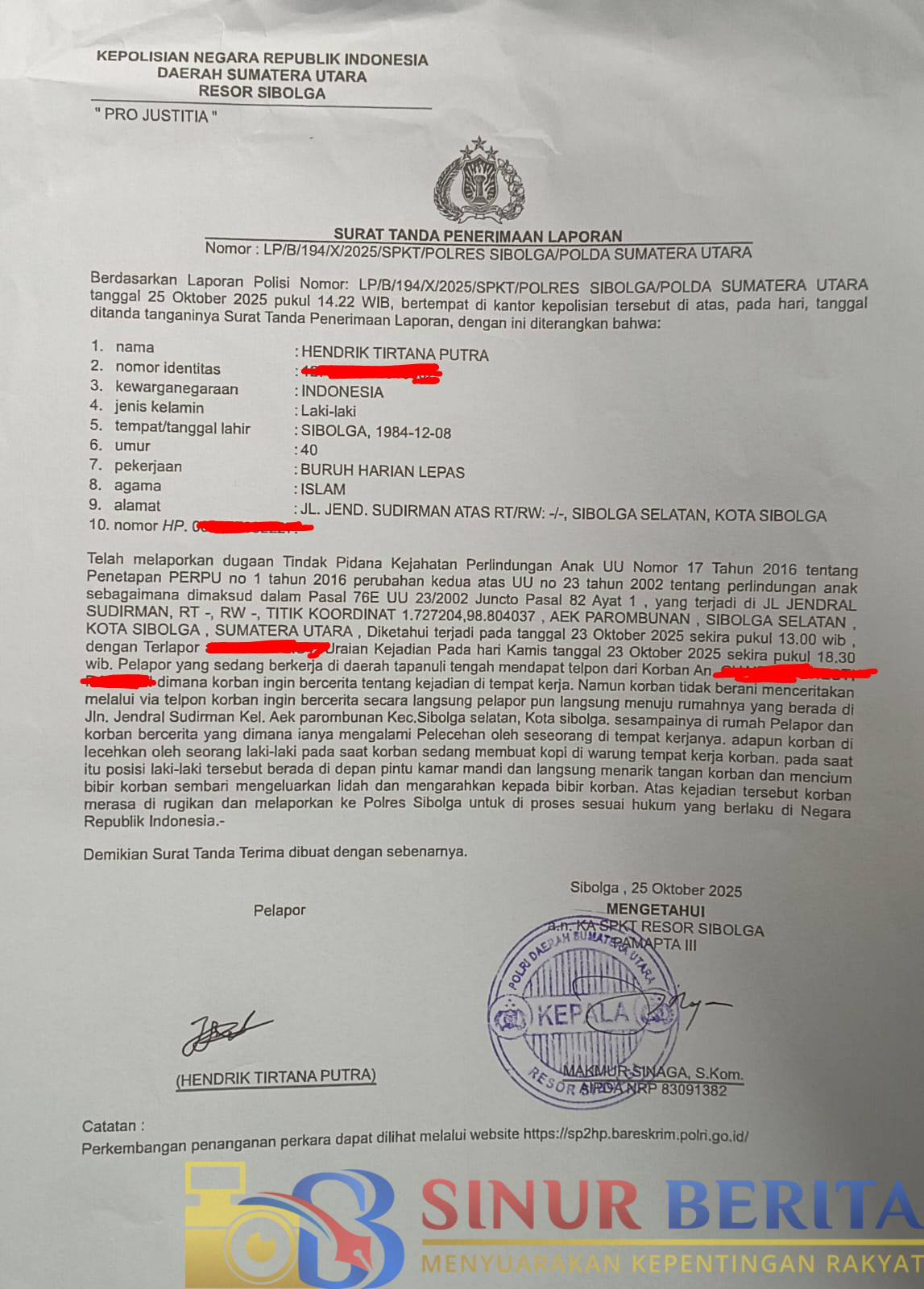 KOTA SIBOLGA (SB) – Seorang oknum pegawai di salah satu instansi Pemerintah Kabupaten Tapanuli Tengah (Tapteng) dilaporkan ke Polres Sibolga atas dugaan tindakan pelecehan seksual kepada anak dibawah umur di salah satu warung kopi di Kota Sibolga yang terjadi pada, Kamis (23/10/2025) sekitar pukul 18:30 WIB.