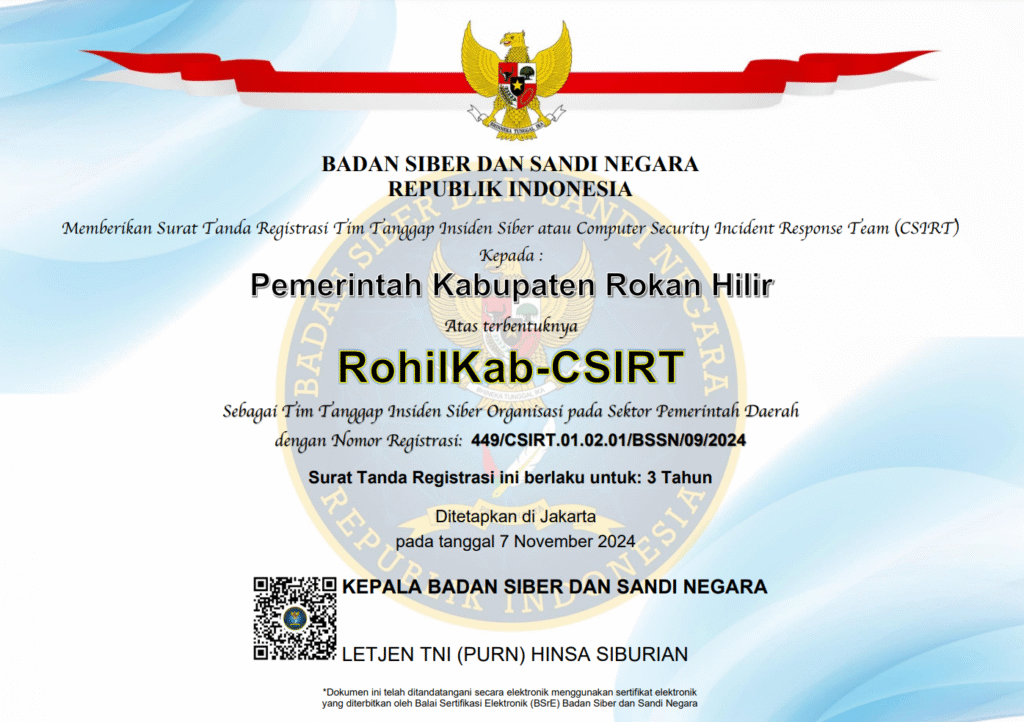 SINURBERITA.COM – Badan Siber dan Sandi Negara (BSSN) Republik Indonesia resmi memberikan pengakuan kepada Pemerintah Kabupaten Rokan Hilir melalui Surat Tanda Registrasi Tim Tanggap Insiden Siber atau Computer Security Incident Response Team (CSIRT). Tim ini diberi nama “RohilKab – CSIRT” dan telah terdaftar sebagai Tim Tanggap Insiden Siber Organisasi Pemerintah Daerah dengan Nomor Registrasi 449/csirt.01.02.01/BSSN/09/2024.
