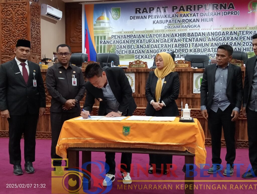 SINURBERITA.COM – Bupati Rokan Hilir (Rohil) Afrizal Sintong hadiri rapat paripurna Dewan Perwakilan Rakyat Daerah (DPRD) Rokan Hilir pada penyampaian laporan akhir Badan anggaran (Banggar) terkait Rancangan peraturan daerah (Ranperda) tentang anggaran pendapatan dan belanja daerah (APBD) Tahun Anggaran 2025 oleh banggar DPRD Kabupaten Rokan Hilir sekaligus pengambilan keputusan. Dimana APBD Rohil di sahkan sebesar Rp 2,6 Triliun lebih pada, Jumat (7/02/2025) malam di Aula sidang utama Kantor DPRD Rohil Jalan Lintas Pesisir Batu Enam, Bagansiapiapi, Rohil, Provinsi Riau.