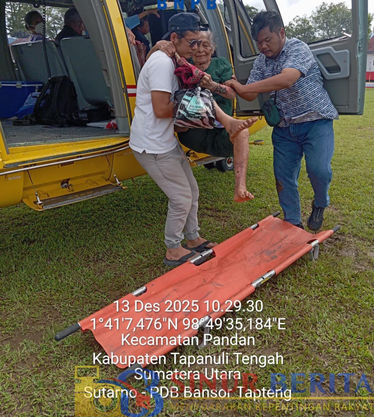 TAPTENG, SINURBERITA.COM – Dinas Kesehatan (Dinkes) Kabupaten Tapanuli Tengah (Tapteng) bersama Tim Tanggap Darurat Bencana Alam Banjir Bandang dan Longsor Kabupaten Tapanuli Tengah kembali mengevakuasi empat warga dari Desa Sait Kalangan II, Kecamatan Tukka, yang dirujuk berobat ke RSUD Pandan menggunakan helikopter BNPB, Sabtu (13/12/2025),