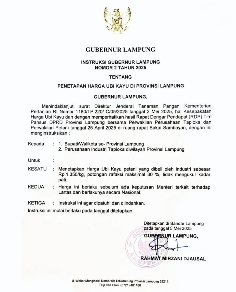 SINURBERITA.COM || Dengarkan Keluhan Petani Singkong, Gubernur Lampung Rahmat Mirzani Djausal Terbitkan Instruksi Gubernur Lampung Nomor 2 tahun 2025 tentang penetapan harga ubi kayu di Provinsi Lampung.