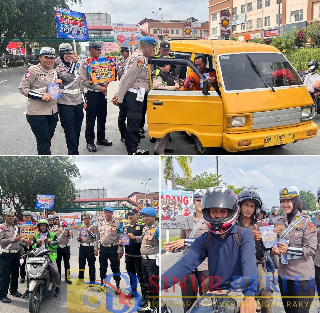 Dilokasi kegiatan terlihat Tim Satgas Preemtif OPS Keselamatan Lancang Kuning 2025 menyapa pengendara sembari membagikan brosur himbauan tertib berlalu lintas.
