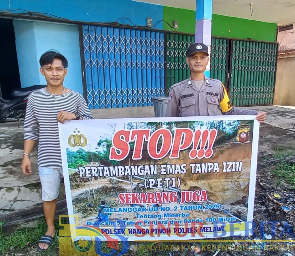 MELAWI || Polsek Nanga Pinoh, Polres Melawi, Polda Kalbar memastikan langkah Polri dalam mencegah aktivitas Pertambangan Emas Tanpa Ijin (PETI). Polsek Nanga Pinoh melakukan sosialisasi langsung kepada masyarakat dengan media spanduk.