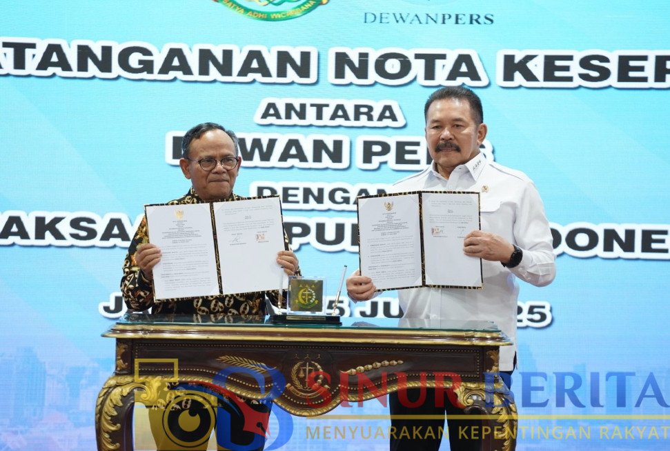 SINURBERITA.COM || Kejaksaan Agung Republik Indonesia (Kejagung RI) dan Dewan Pers resmi menandatangani Nota Kesepahaman (MoU) terkait koordinasi penegakan hukum, perlindungan kemerdekaan pers, peningkatan kesadaran hukum masyarakat, serta penguatan kapasitas SDM, Selasa (15/7/2025).