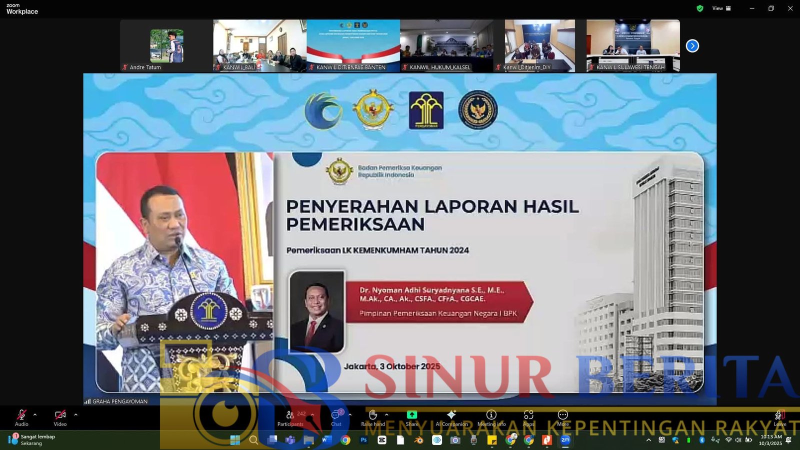 PEKANBARU (SB) – Kantor Wilayah Kementerian Hukum (Kanwil Kemenkum) Riau bersama Kanwil Direktorat Jenderal Imigrasi, Kanwil Direktorat Jenderal Pemasyarakatan, serta perwakilan Kementerian HAM di Riau mengikuti kegiatan Penyerahan Laporan Hasil Pemeriksaan (LHP) BPK RI atas Laporan Keuangan Kementerian Hukum dan HAM Tahun 2024 secara virtual. Jajaran mengikuti kegitan ini di Aula Ismail Saleh Kanwil Kemenkum Riau pada Jumat (3/10) mulai pukul 09.00 WIB.