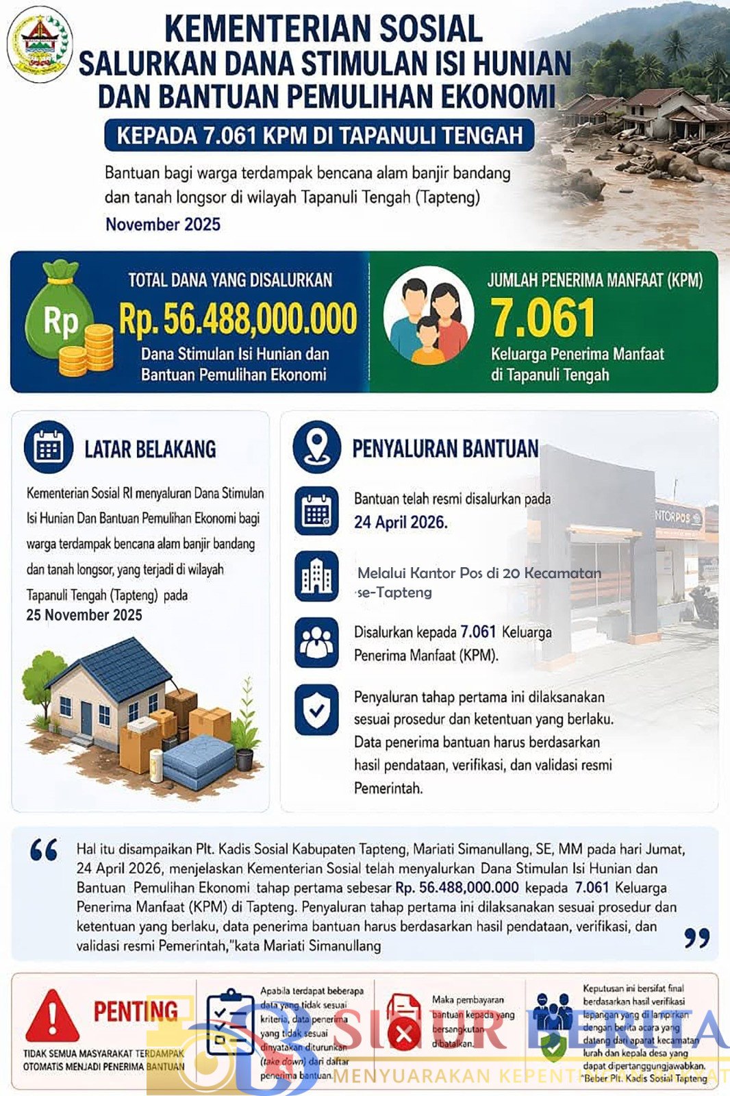 TAPTENG, SINURBERITA.COM – Kementerian Sosial Republik Indonesia (Kemensos RI) menyalurkan Dana Stimulan Isi Hunian dan Bantuan Pemulihan Ekonomi bagi warga terdampak bencana alam banjir bandang dan tanah longsor, yang terjadi wilayah Kabupaten Tapanuli Tengah (Tapteng) pada 25 November 2025. Bantuan telah resmi disalurkan pada tanggal 24 April 2026 melalui Kantor di 20 Kecamatan se-Tapteng.