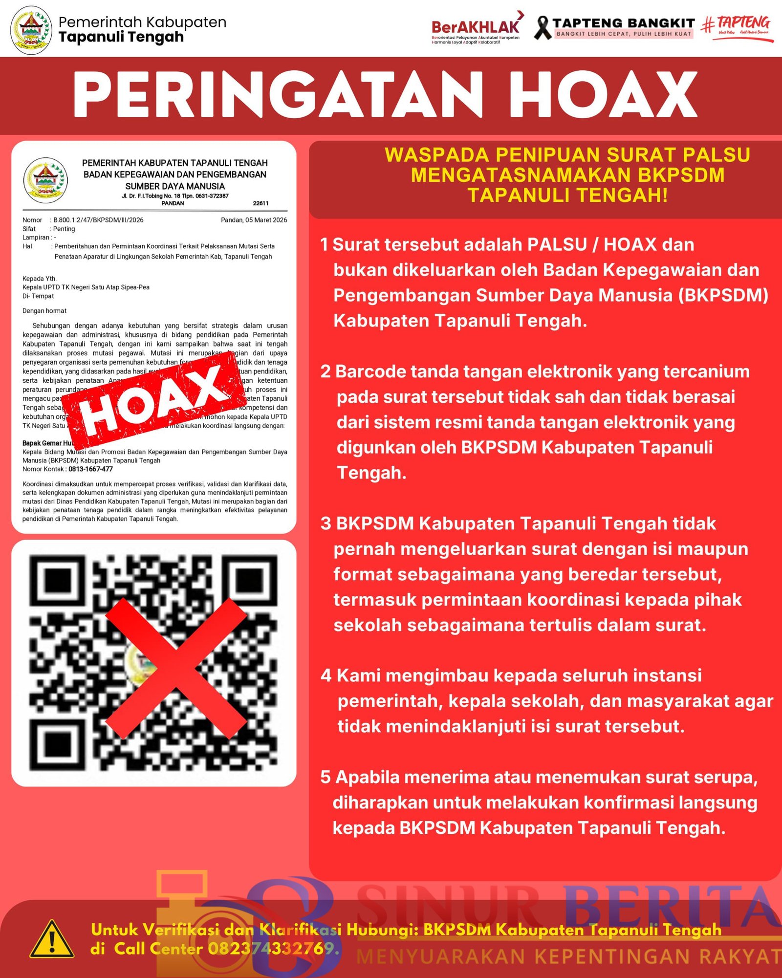 1. Surat tersebut adalah PALSU / HOAX dan bukan dikeluarkan oleh Badan Kepegawaian dan Pengembangan Sumber Daya Manusia (BKPSDM) Kabupaten Tapanuli Tengah.