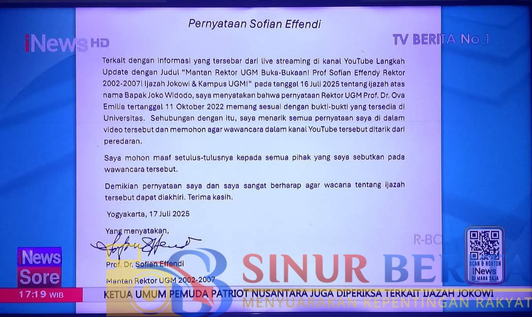 Terkait dengan informasi yang tersebar dari live streaming di kanal YouTube Langkah Update dengan Judul “Mantan Rektor UGM Buka-Bukaan! Prof Sofian Effendy Rektor 2002-2007! ljazah Jokowi & Kampus UGM!” pada tanggal 16 Juli 2025 tentang ijazah atas nama Bapak Joko Widodo, saya menyatakan bahwa pernyataan Rektor UGM Prof. Dr. Ova Emilia tertanggal 11 Oktober 2022 memang sesuai dengan bukti-bukti yang tersedia di Universitas. Sehubungan dengan itu, saya menarik semua pernyataan saya di dalam