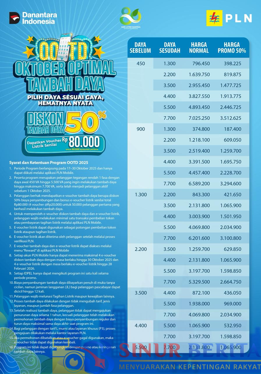 Promo ini berlaku untuk periode 17–30 Oktober 2025, dengan penambahan daya mulai dari 450 VA hingga 7.700 VA. Selain itu, PLN juga memberikan bonus e-voucher listrik senilai total Rp80.000,- bagi 50.000 pelanggan pertama yang berhasil melakukan tambah daya selama masa program berlangsung.