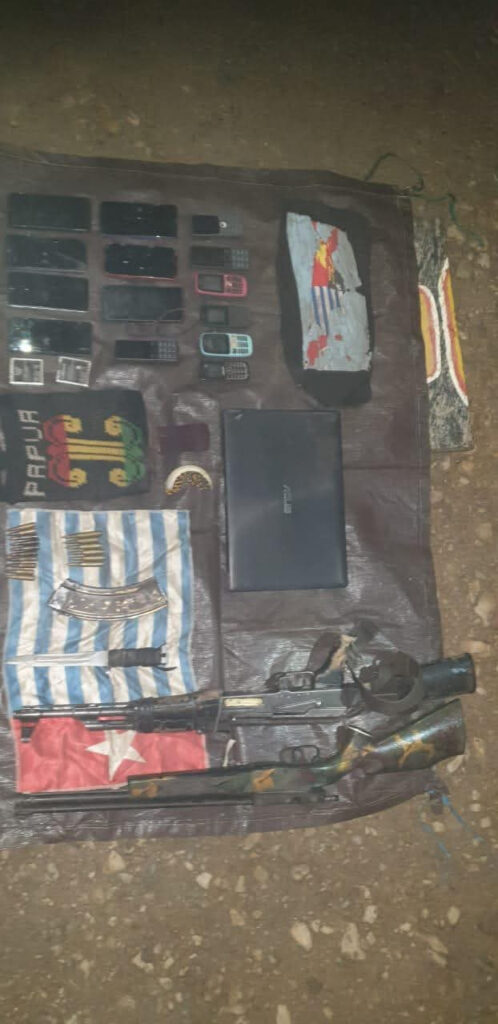 Satgas TNI juga mengamankan sejumlah barang bukti, antara lain satu pucuk senjata organik AK-47, satu senjata rakitan, puluhan butir munisi, busur dan anak panah, serta bendera Bintang Kejora dan alat komunikasi.