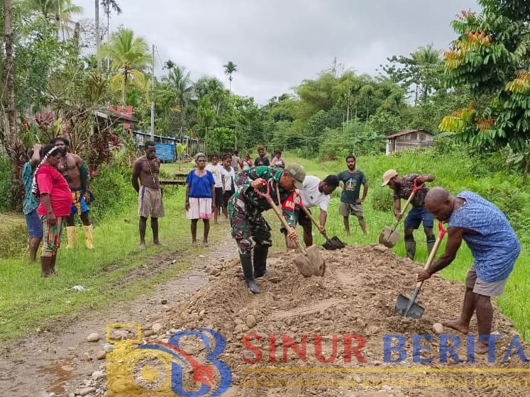 SINURBERITA.COM || Dalam upaya memperlancar akses transportasi dan meningkatkan kepedulian warga terhadap lingkungan sekitar, Bintara Pembina Desa (Babinsa) Koramil 1710-06/Agimuga, Kodim 1710/Mimika, Serka Suminar melaksanakan kegiatan gotong royong bersama masyarakat untuk menimbun jalan rusak di wilayah binaannya, di Kampung Emogoma, Distrik Agimuga. Rabu (23/7/2025).