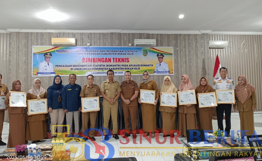 ROKAN HILIR || Pemerintah Kabupaten Rokan Hilir (Rohil) melalui Dinas Komunikasi Informasi Statistik dan Persandian (Diskominfotiks) memberikan bimbingan teknik (Bimtek) Pengajuan Rekomendasi Statistik (Romantik) pada aplikasi romantik di Lingkungan Pemerintah Kabupaten Rokan Hilir sekaligus penyerahan Piagam Penghargaan Bupati Rohil kepada 10 Kepala Dinas yang telah diterbitkannya rekomendasi kegiatan statistik sektoral tahun 2025 pada kegiatan kompilasi data penanganan pasca bencana di Rohil.